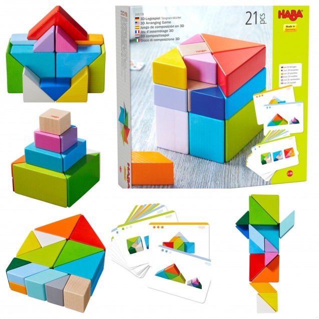 Este maravilloso Tangram Cube 3D es un juego de construcción en madera lacada de Haba, inspirado en el tradicional juego de piezas chino Tangram. El Tangram en su versión tradicional cuenta con 7 piezas dispuestas como un cuadrado. Las piezas de Tangram tienen la siguiente distribución: 5 triángulos (dos construidos con la diagonal principal del mismo tamaño, los dos pequeños de la franja central también son del mismo tamaño y uno de tamaño medio ubicado en una esquina); 1cuadrado y 1 romboide o paralelogramo.¡Este cubo se las trae! Y lo que trae son piezas de colores basadas en las formas básicas del tangram. Colocadas con ingenio unas al lado de las otras, estas piezas impresas y de alegres colores dan como resultado las formas geométricas y las figuras más diversas. Y gracias a las posibilidades de composición - con plantilla o completamente libre - ¡crece la ilusión por experimentar de las pequeñas y pequeños artistas!. Haba le da la vuelta al clásico y lo convierte en un juego de lógica en 3D. Utiliza las plantillas-reto para manipular las piezas y construir con ellas lo que aparece en la plantilla o simplemente experimenta con las bonitas formas que podrás crear con ellas. Experimenta con las diferentes alturas para crear estructuras bonitas y diferentes cada vez. El Tangram Cube 3D de Haba es una invitación a la creatividad y la imaginación desarrollando la lógica espacial y el razonamiento abstracto. Juguete afín a la pedagogía Montessori. Apto a partir de 2 hasta 99 años. Calidad y diseño Haba.