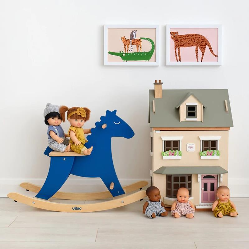 Precioso balancín de madera de diseño moderno. Vilac nos ofrece este clásico de siempre, un caballo balancín, renovado de líneas sencillas y estilizadas que incluye un soporte y are de seguridad para usarlo con pequeños que aún no caminan. En un bonito tono azul oscuro y detalles en madera natural, este caballo es estable y seguro. Descubre el caballito balancín Hudada Blanco con arco de seguridad de Vilac para niños a partir de 1 año. Un soberbio caballito de madera maciza para columpiarse y despertarse con total seguridad.