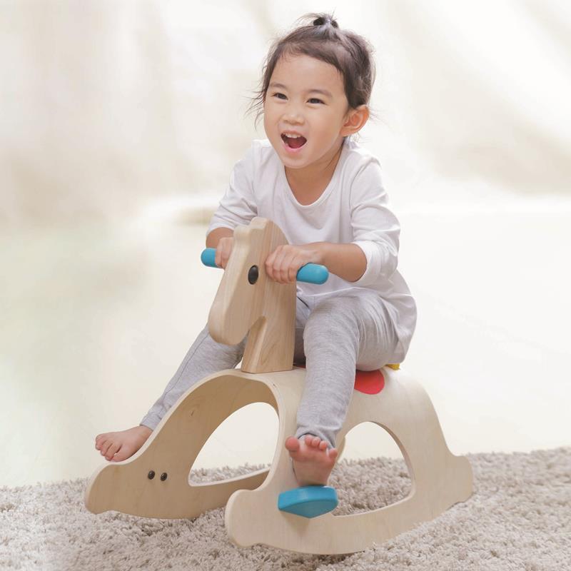 Palonm is built on parallel rockers so children can rock backwards and forwards. By rocking on toys like the Palomino, children will gain better balance and strength in their leg muscles. Rocking horses are also great for role play. Plan Toys manufactures their toys in a sustainable manner. They were the first company to use wood is from rubber trees that are no longer productive. Such trees would normally be cut down and burned. Palomino Rocking Horse is made in Thailand. Some assembly is required.