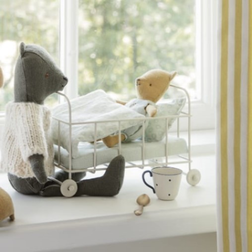 cuna con aire romántico para los ratones y conejos más adorables del planeta. Su tamaño micro lo hace perfecto para ratones y conejitos micro y My de la marca Maileg. Dormir y soñar con las estrellas será sencillo en esta cuna de metal esmaltado en blanco roto y colchón de rayas y manta con delicadas flores, todo en algodón.