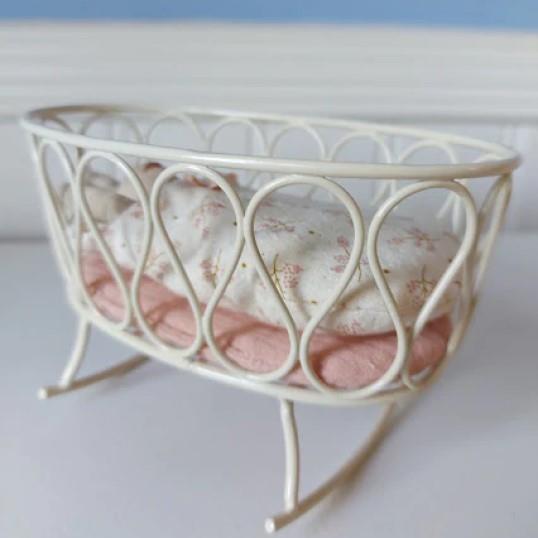 cuna con aire romántico para los ratones y conejos más adorables del planeta. Su tamaño micro lo hace perfecto para ratones y conejitos pequeños de la marca Maileg. Dormir y soñar con las estrellas será sencillo en esta cuna balancín de metal esmaltado en blanco roto y colchón y manta de algodón.