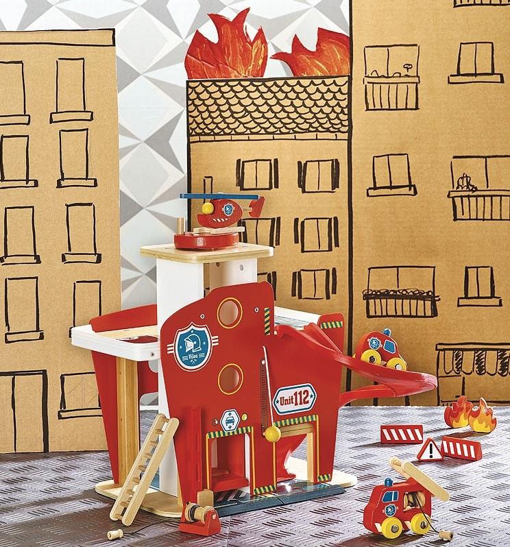 Fire! The "Unit 112" fire station is ready to go! The helicopter is ready to take off from the heliport, the fire engine goes down the ramp and out through the sliding door and the other fire engine passes the moving barrier. A total of 10 wooden accessories to create many scenarios: 2 flames, 1 ladder, 2 roadblocks, 1 traffic sign and 1 winding fire hose (1 helicopter and 2 fire engines). There is also an elevator between the 2 floors. An ideal toy to develop your child's eye-hand coordination and imagination, alone or with friends. An unforgettable gift for a third birthday or for Christmas!
