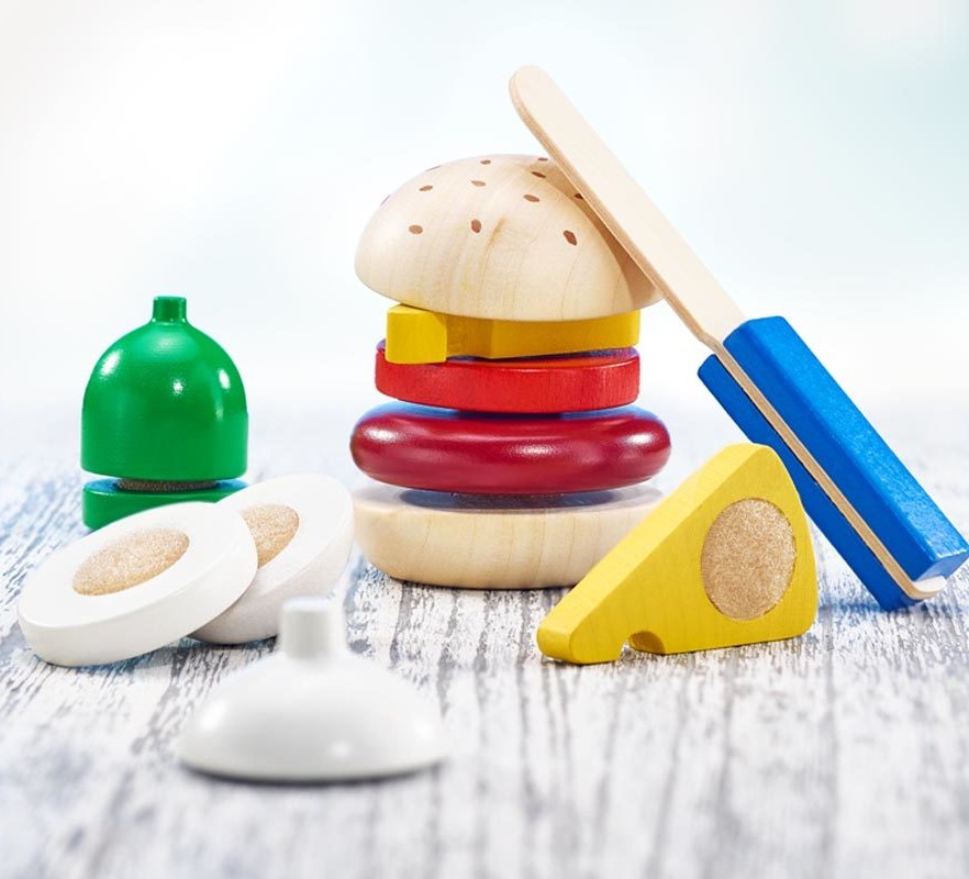 Pan rebanado, queso, cebolla, un tomate fresco y pepino... ¡Uhmm, qué rico! así serán las comidas de los peques de casa con este divertido juego de comiditas para preparar una hamburguesa. Incluye un cuchillo para cortar. Un precioso juego de madera maciza con la indiscutible calidad de Selecta Spielzeug. A partir de 2 años. Favorece la coordinación mano ojo y la psicomotricidad fina. Además, al ser un juego simbólico, potencia la imaginación y las destrezas sociales.
