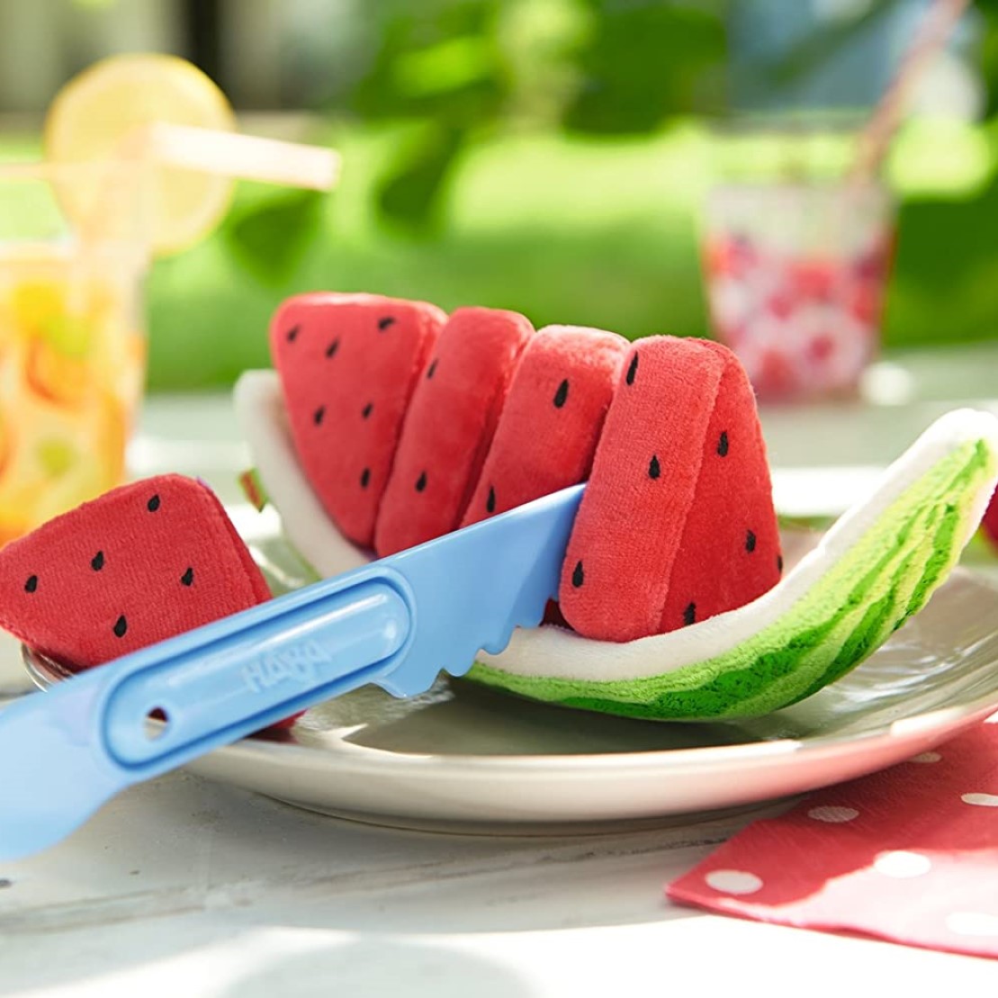 Un trozo de sandía fresquito para el verano más caluroso es la mejor alternativa. Este trozo de sandía blando y de suave velour tiene 5 trozos para cortar con el cuchillo incluido. También podrás separarlo de su concha y jugar de forma realista. Un accesorio divertido para cualquier cocinita, restaurante o mercado y que aportará mucho al juego simbólico mientras desarrolla la coordinación ojo-mano, y las habilidades sociales y de lenguaje. Con la calidad Haba, este set incluye trozo de sandía divisible en 5 partes gracias al velcro y un cuchillo de plástico seguro para las manos más pequeñas. Apto a partir de 3 años.