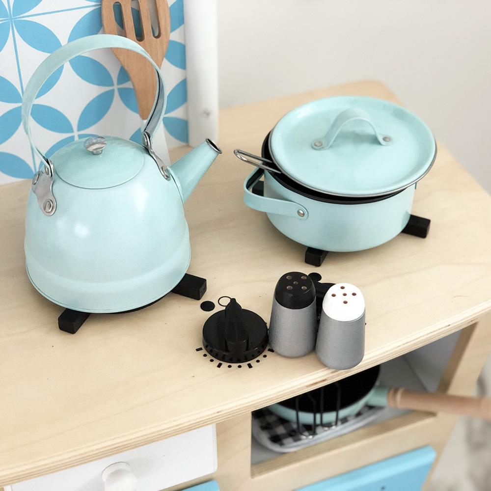 Este set de menaje es perfecto para complementar nuestra cocinilla Vintage. Su turquesa retro encantará a todos y su diseño lo hace ideal para cualquier cocinero en ciernes. Inclute tetera con tapa, olla con tapa y sartén. Además tres utensilios de metal y un agarra ollas. El kit perfecto para cualquier principiante. Apto a partir de 3 años. Calidad Vilac. Los bordes de metal son redondeados para mayor seguridad y el mago de la sartén es de madera.