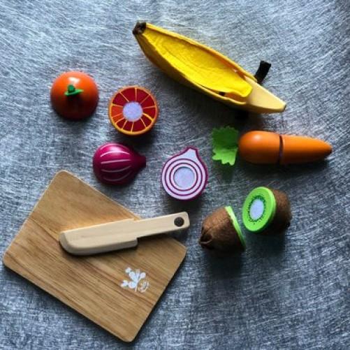 ¡Hora de las vitaminas! Corta las verduras por la mitad con el cuchillo, usa la tabla de cortar de madera y no te olvides de pelar la piel peluda del kiwi o la resbaladiza del plátano. Las verduras de juguete están hechas de madera y tienen velcro para que las dos mitades permanezcan juntas y puedan cortarse fácilmente por la mitad usando el cuchillo de madera incluido. El plátano y el kiwi de madera tienen piel de fieltro. ¡Una caja de cartón llena de vitaminas de Vilac! Apto a partir de 3 años.