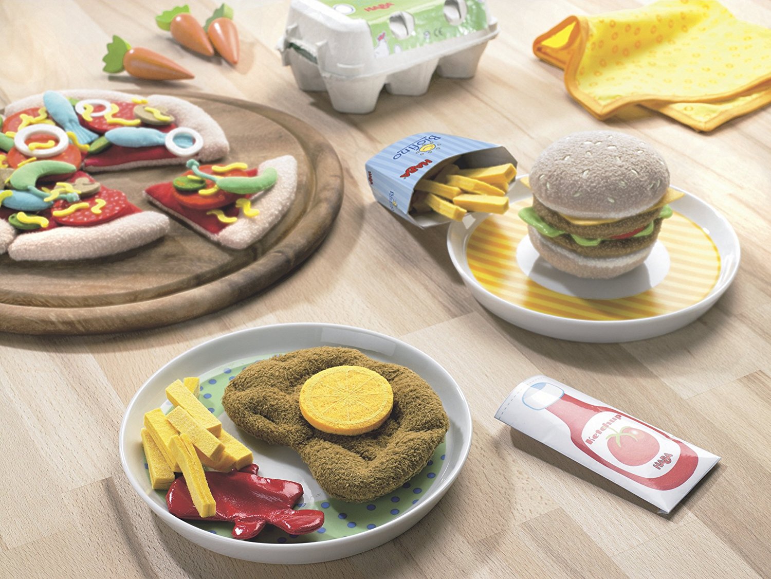 Divertido escalope con una rodaja de limón, patatas y fritas y ¡claro ketchup!. Haz de sus juegos de cocinitas una experiencia genial con este maravilloso set de la línea Biofino de Haba. Realizado en tela y plato de melamina. A partir de 3 años.