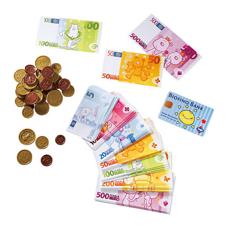 Dinero de juguete para jugar a las tiendas. En euros. Ayuda en el aprendizaje de las matemáticas y el cálculo. Contiene: 7 x 15 billetes de banco con un valor de 5 a 500 Euros / 1 tarjeta de crédito / 8 x 5 monedas
