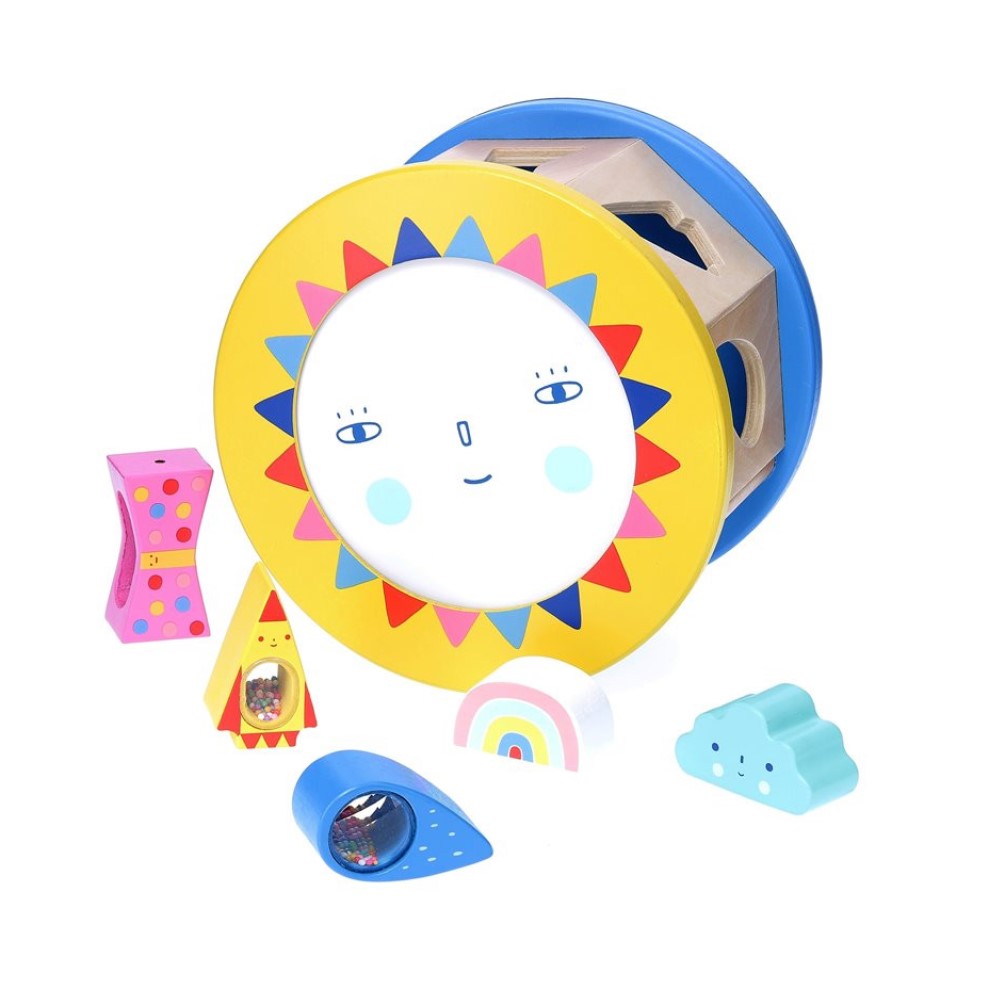 Desarrolla los sentidos, la motricidad fina y el ritmo y movimiento con esta caja-tambor estupenda que Suzy Ultman ha diseñado para Vilac. Las piezas con sus contornos no geométricos son un paso más allá de las típicas cajas de clasificar. Además las piezas incluyen elementos sensoriales para estimular la curiosidad y el tacto, oido y vista de tu peque. La cara Sol es un precioso tambor y la cara Luna es una base de madera sólida para que al caer las piezas dentro, o al hacer rodar la caja tengan sonidos diferentes. La forma de recuperar las piezas será introduciendo la mano entre las gomas lo que supondrá también otro estímulo diferenciador de esta maravillosa caja de clasificación Día y Noche de Vilac. Agitar, mirar, tocar, hacer rodar y descubrir los elementos (contiene 6 piezas con formas de pájaro, nube, arcoíris, gota, cohete y corbatín) será un placer para las manos y ojos curiosos de tu pequeñx. Un juego divertido, multifuncional y muy original de Vilac para niños y niñas a partir de 18 meses en adelante.