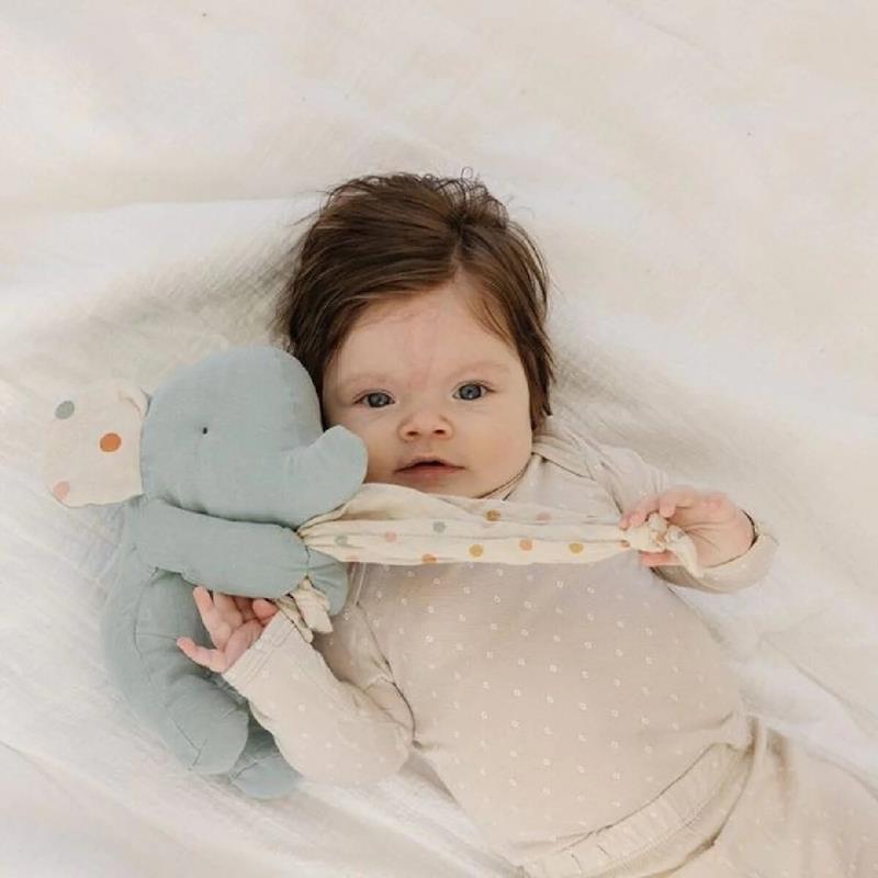 Lullaby Friends es la nueva colección de muñecos musicales para bebés y recién nacidos de Maileg. Este elefante guarda en su interior una caja de música para acompañar su descanso. Fabricado en delicado lino lleva entre sus patitas una mantilla de suave muselina de algodón que le acariciará. Detalles bordados para diseñar la carita y la calidad a la que Maileg nos tiene acostumbrados. Presentado en una bonita y robusta caja de cartón decorada, este muñeco será el compañero ideal de cualquier recién nacidx. Delicado, suave y con una melodía que le invitará a relajarse y dormir plácidamente. El sistema de música es por cuerda, no lleva ningún tipo de mecanismo electrónico ni precisa del uso de baterías. Un Elefante tan tierno y gustoso al tacto que no habrá pequeñx que se resista a abrazarlo.