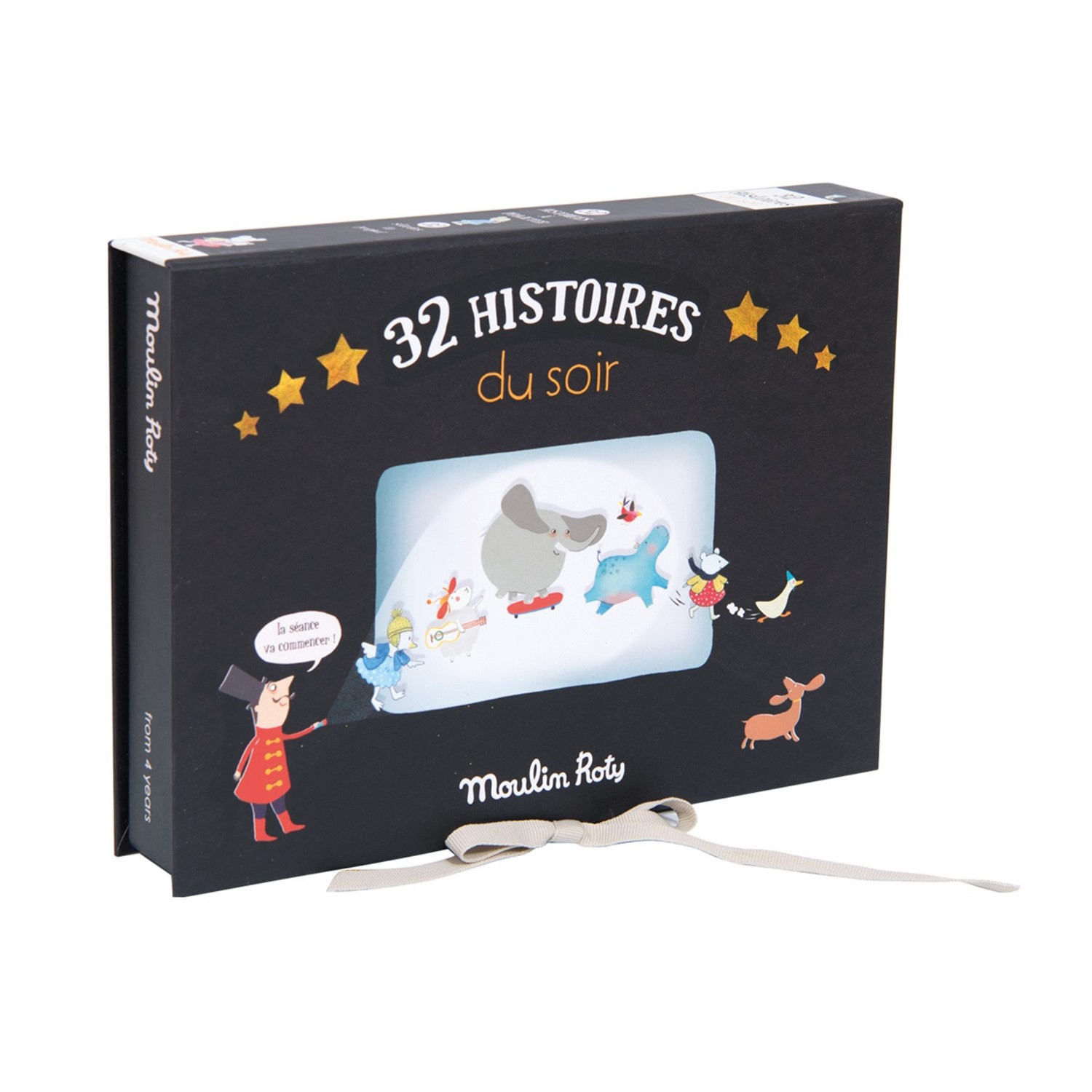 El Cinema Box Histoires du soir de Moulin Roty es la oportunidad perfecta para demostrar tu talento a la hora de contar historias. Solamente la imaginación pondrá límites a las pequeñas grandes mentes de tus peques. Maravillosas historias podrán ser creadas. Este pequeño-gran set de cine contiene 32 historias diferentes, la compilación de todas las historias que hasta este momento ha creado Moulin Roty. Prepárense para vivir la magia del cine: despliega la pantalla, corran las cortinas, recoge los tíckets de entrada a cada espectador, presta atención que ya la luz está proyectada... 5, 4, 3, 2, 1....  ¡deja rodar la película! y a soñar... Apto a partir de 4 años.