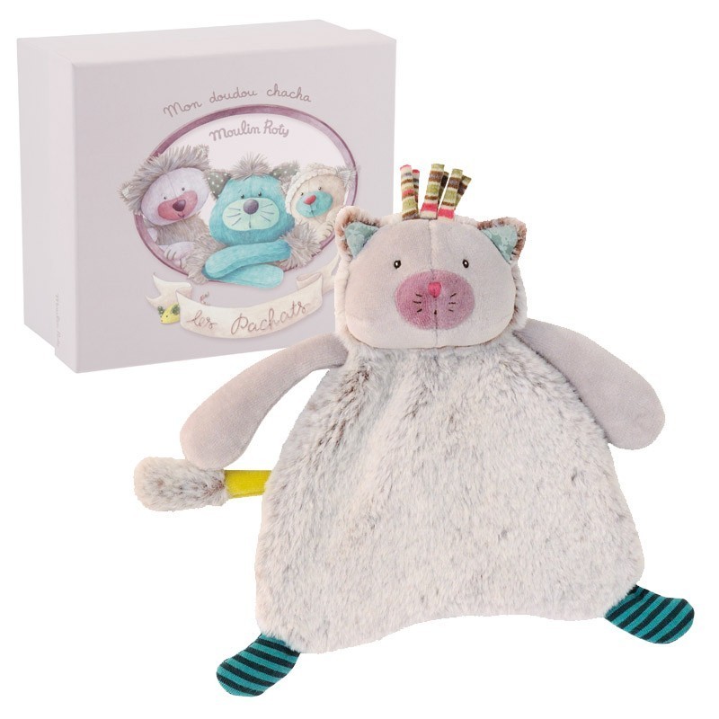 Un suave y gustoso dou dou, delicado como una caricia. Este tierno y mullido gatito acompañará a tu bebé en sus sueños, trayendo el suave olor de mami de vuelta... Realizado en felpa suave de algodón, está lleno de detalles con mezcla de suaves telas y cálidos colores. Viene presentado en una delicada caja de cartón ilustrada. Su presentación lo hace ideal para un regalo de nacimiento y/o Baby Shower. Fabricado en Francia, calidad y diseño Moulin Roty.
