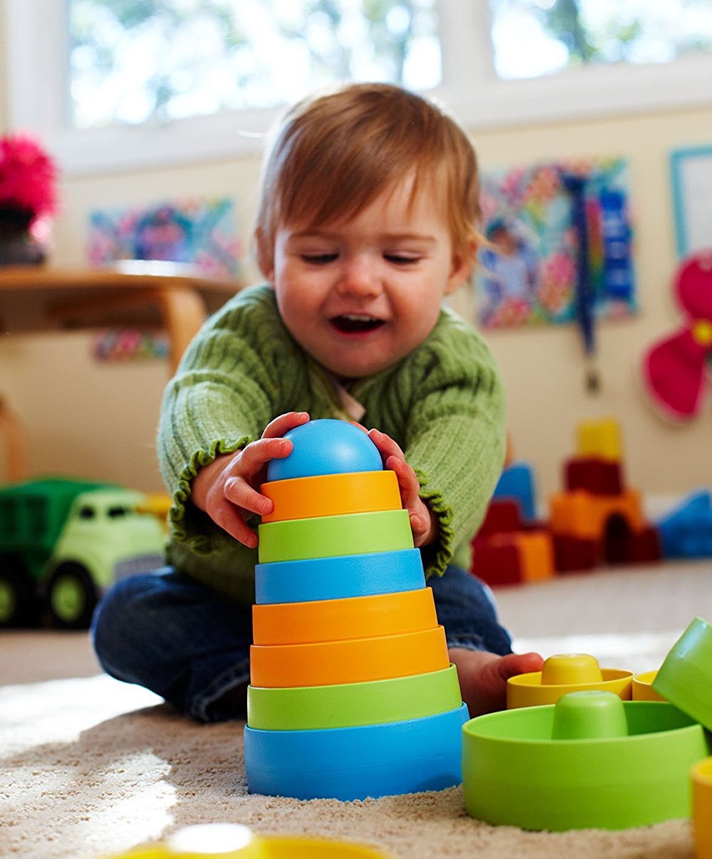 The Green Toy Stacker takes a classic toy and makes it safer and more playful. The eight colored nesting pieces stack easily, and can stack in any order. Most importantly, the Green Toys Stacker is safe. Its unique design has no center post. No BPA, PVC, phthalates, or external coatings. This Stacker is made in the USA from 100% recycled plastic milk containers which save energy and reduce greenhouse gas emissions. Packaged using only recycled and recyclable materials and printed with soy inks.