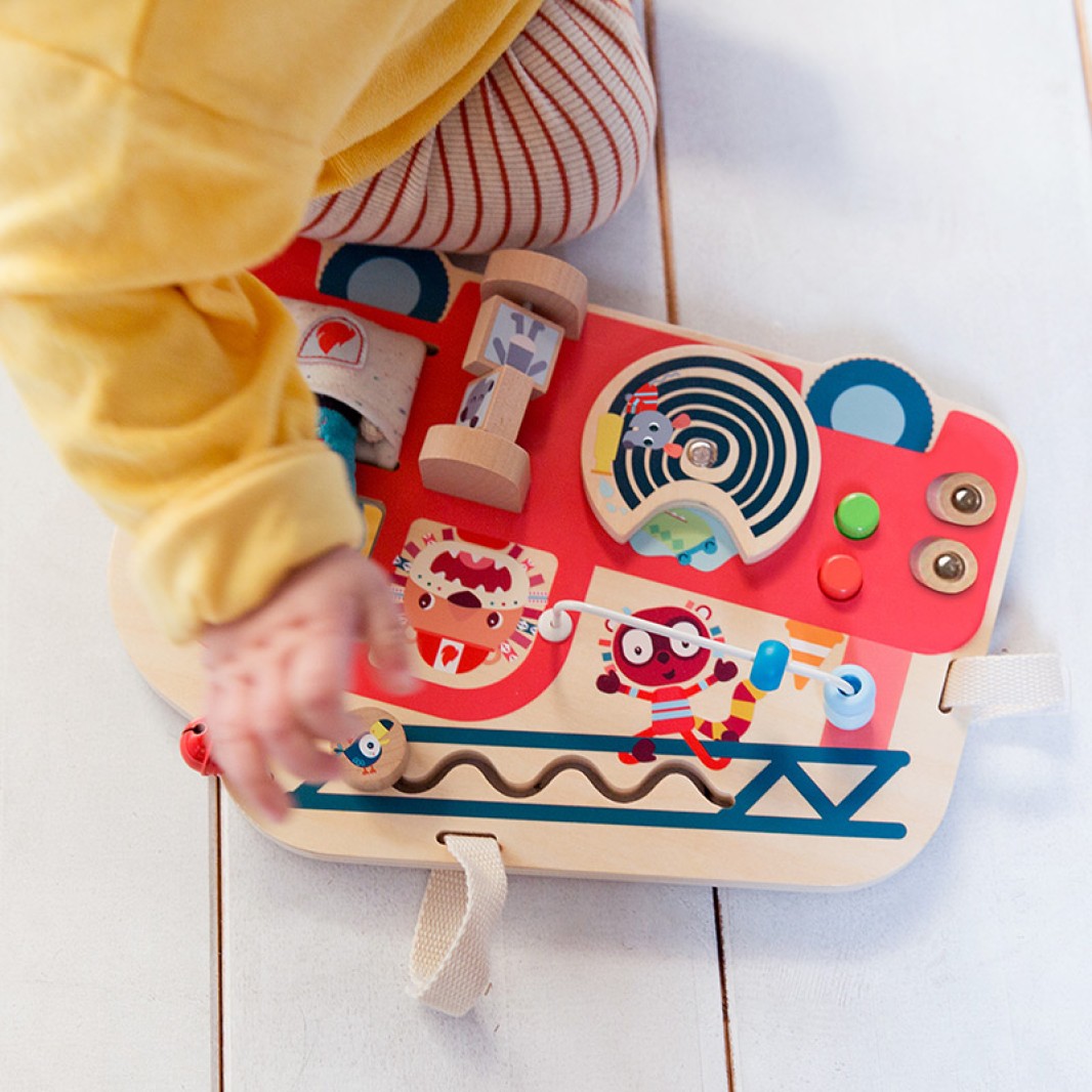 Un tablero de manipulación de madera con forma de Camión de Bomberos de la marca belga Lilliputiens. Este panel, afín a la Pedagogía Montessori, es una original fuente multifuncional de entretenimiento y aprendizaje para los más peques, estimulando la investigación y su curiosidad. El juguete tiene muchas funciones: una varilla de metal con 3 cuentas deslizantes, una antena flexible, una campana, un espejo seguro con 5 cuerdas de goma para golpear, meter los dedos o estirar, 3 botones para presionar, 2 bloques giratorios, una pista con una abeja en movimiento para moverse y una rueda giratoria de gran tamaño, debajo de la cual se esconden los personajes de las colecciones Jungle. Además, en un bolsillo se esconde el Flamenco Anais: un suave sonajero colgado de una cuerda que se puede esconder y guardar nuevamente dentro del bolsillo especial.