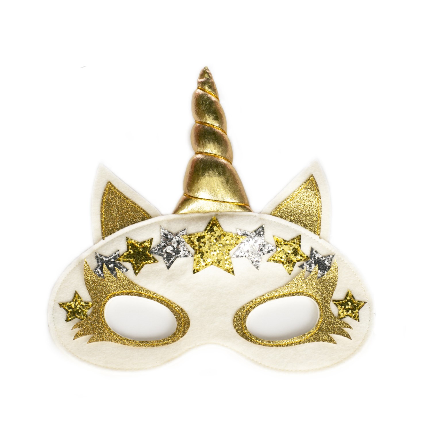 Si "solo" un unicornio no es suficiente, ¿probamos tal vez con uno dorado? Esta máscara de fiesta está hecha de lana merino australiana (producida sin exponer a las ovejas a atrocidades), cuero vegano y decorada con purpurina respetuosa con el medio ambiente. No pica y tiene una goma ancha en la parte trasera y un cordón para ajustar el ajuste. A partir de 3 años.