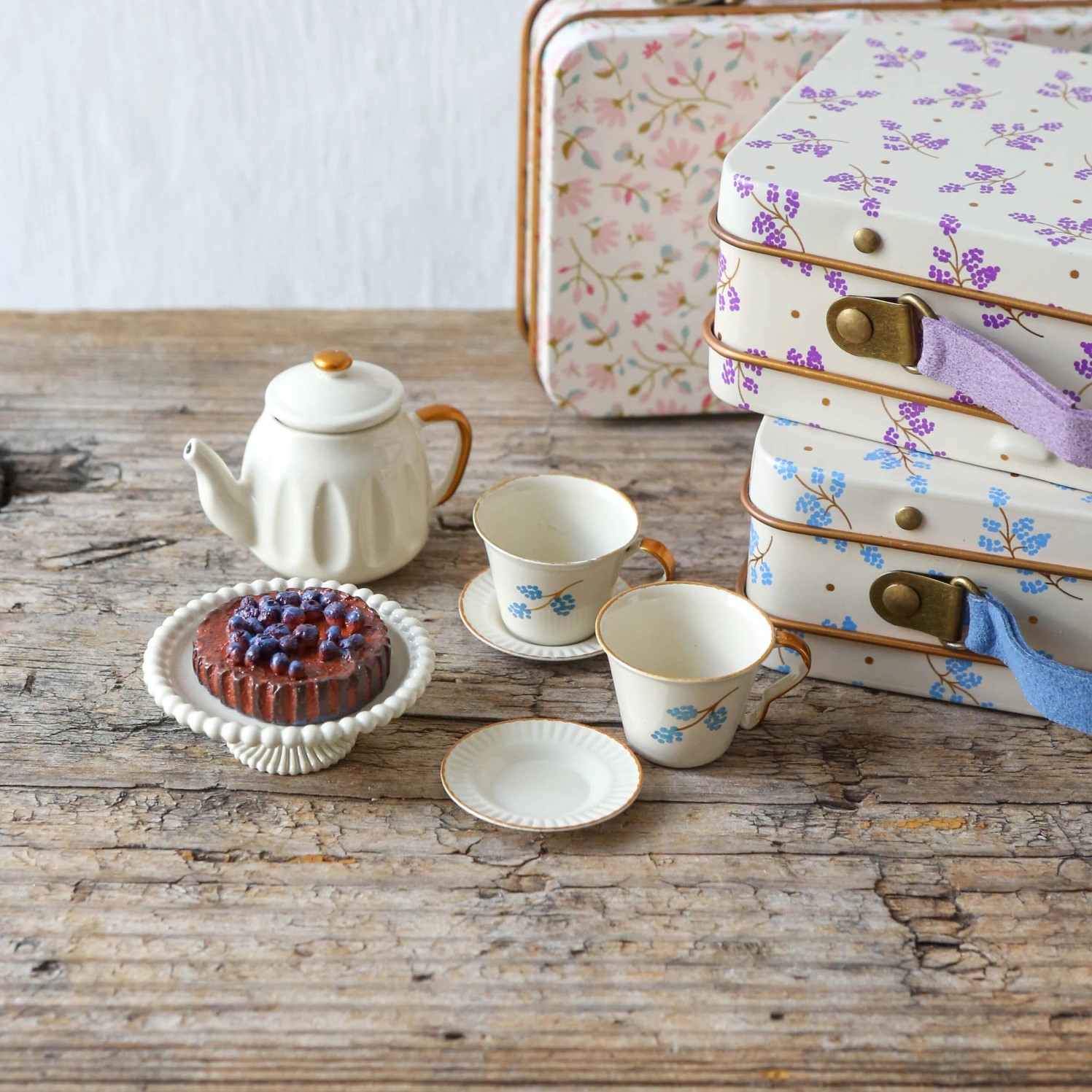 Son las 5 en punto y ya es la hora del té y.. ¿Quién mejor para dar una Tea Party que la familia ratona de Maileg?. Abre esta maravillosa maletita de metal con detalles florales azules y dorados, dentro encontrarás una deliciosa tarta tipo pie de arándanos con plato para servir, una tetera y dos tazas de metal en blanco hueso y un precioso borde dorado para servir el té. Un regalito delicado y tan bonito que no podrás parar de jugar. Apto a partir de 3 años. Calidad y diseño nórdico Maileg.