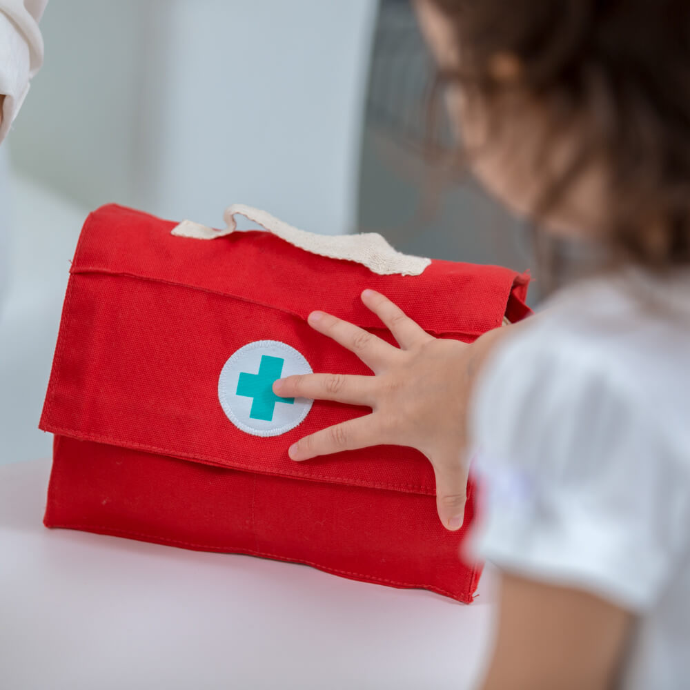 Everything that the little doctor needs. Feeling poorly? Then you need to visit the young doctors in the nursery! In their special case they have all the useful equipment necessary for examinations – and all in a safe, child-sized design. Contents: stethoscope, blood pressure meter with a squeaky bulb, thermometer with a scale, syringe, otoscope, medicine bottle, prescription pad. Size: 10 x 7 x 3¼ in.