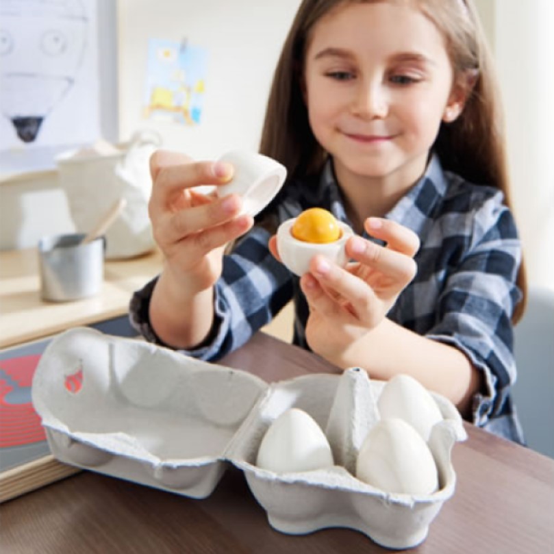 Para los amantes del desayuno saludable. 4 huevos de madera que al abrirlos muestran una preciosa y colorida yema que también podrás extraer. Los huevos cocidos vienes presentados en una bonita huevera de cartón como las que encuentras en el supermercado. Fabricados en madera de haya y pintados con tintes atóxicos aportarán realismo al juego simbólico. Haba vuelve a acertar con este precioso juego de su línea de comiditas que, por su realismo y fino acabado, enriquecerán el juego imaginativo y de imitación de nuestros peques. Ideal para añadir a los bazares, mercados y cocinitas. Calidad Haba. A partir de 3 años. ¿Qué beneficios ofrece este juego?