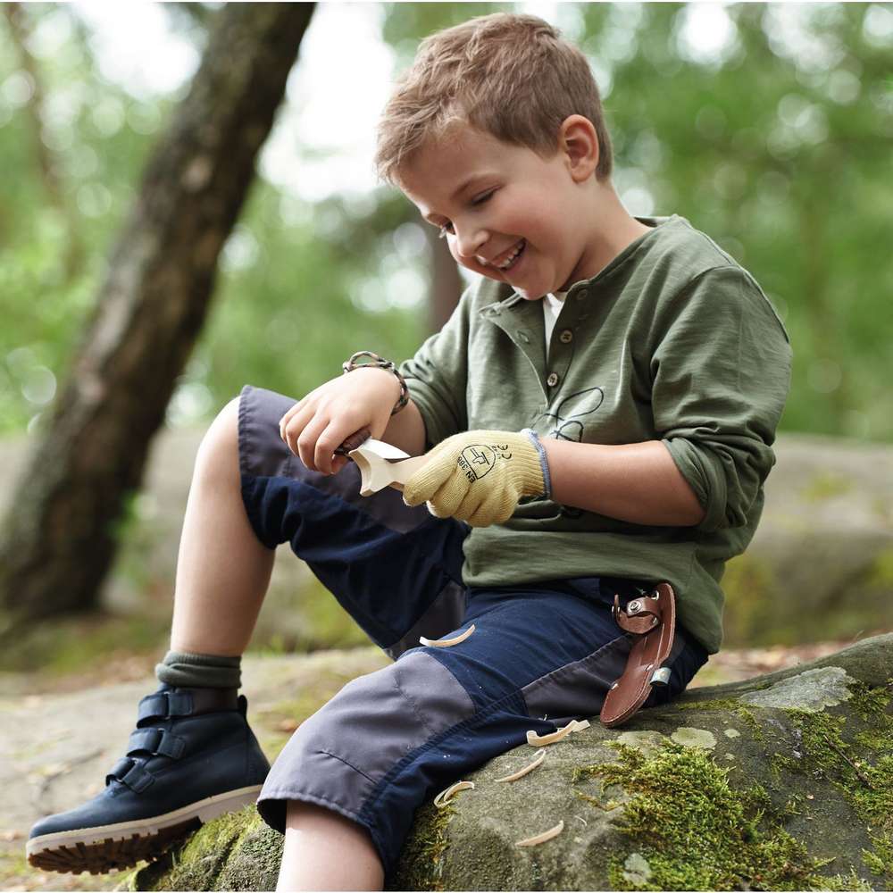 Con este Cuchillo para Tallar de la línea Terra Kids de Haba, podrás iniciarte en el trabajo de la madera. Con la pieza en bruto y el manual de instrucciones será una excelente iniciación en el precioso arte de la talla. Incluye cuchillo, pieza en bruto, guante y una funda de cuero para el cinto. Longitud del cuchillo 13,50 cm. Apto a partir de 8 años bajo supervisión de un adulto.