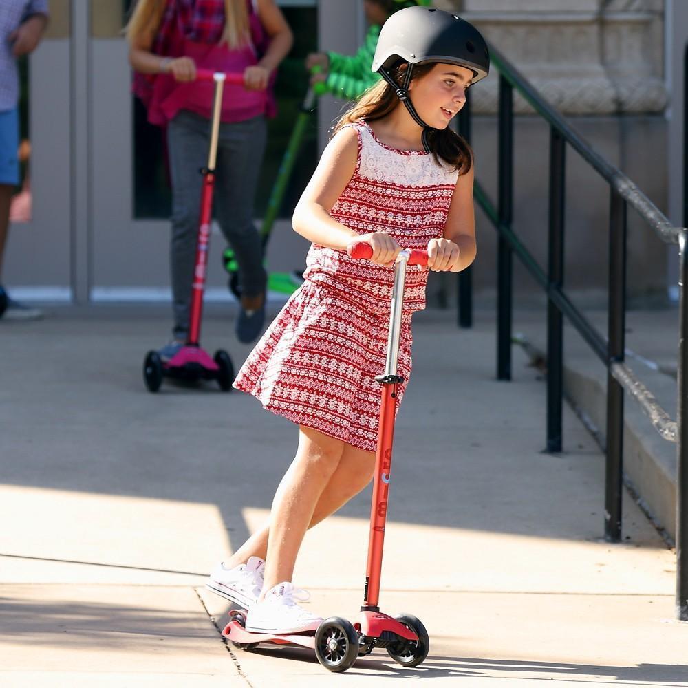 Como su hermano pequeño Mini Micro, los patinetes MAXI MICRO han sido diseñados en colaboración con pediatras suizos para ayudar al desarrollo psicomotor de los niños. Esto se consigue gracias a su sistema de giro patentado inclínate y gira, el cual también hace aún más divertida su conducción. Estos patinetes están fabricados con materiales de alta calidad, que le otorga de una gran resistencia y durabilidad. Son muy ligeros y fáciles de transportar. La base está fabricada en fibra de vidrio para en caso de romperse que no deje cantos cortantes. Además el Maxi Micro incorpora en la parte trasera una rueda doble, que le da una mayor estabilidad y facilidad a la hora de frenar. ¡Es el juguete que le ayuda a desarrollarse! Apto de 5-12 años. El Maxi Micro nace con la idea de ser el siguiente paso para los niños tras el Mini Micro. La edad recomendada para el Maxi Micro es de 5 a 12 años. Su suave dirección y su base antideslizante le darán al usuario una conducción especialmente segura sobre su Maxi Micro Deluxe. Características: • Color Rojo • Puños antideslizantes con acabado redondeado. • Barra de dirección de aluminio, acabado metalizado. • Fácil montaje y desmontaje con un solo clic. • Sistema de dirección patentado inclínate y gira. • Ruedas delanteras con luz led blanca para mayor seguridad • Plataforma flexible fabricada en polipropileno • Plataforma con alta resistencia contra golpes e impactos • Serigrafia de goma, antideslizante • Freno trasero que no se calienta ni desgasta la rueda. • Tiras reflectantes en la parte trasera • Rueda trasera doble.