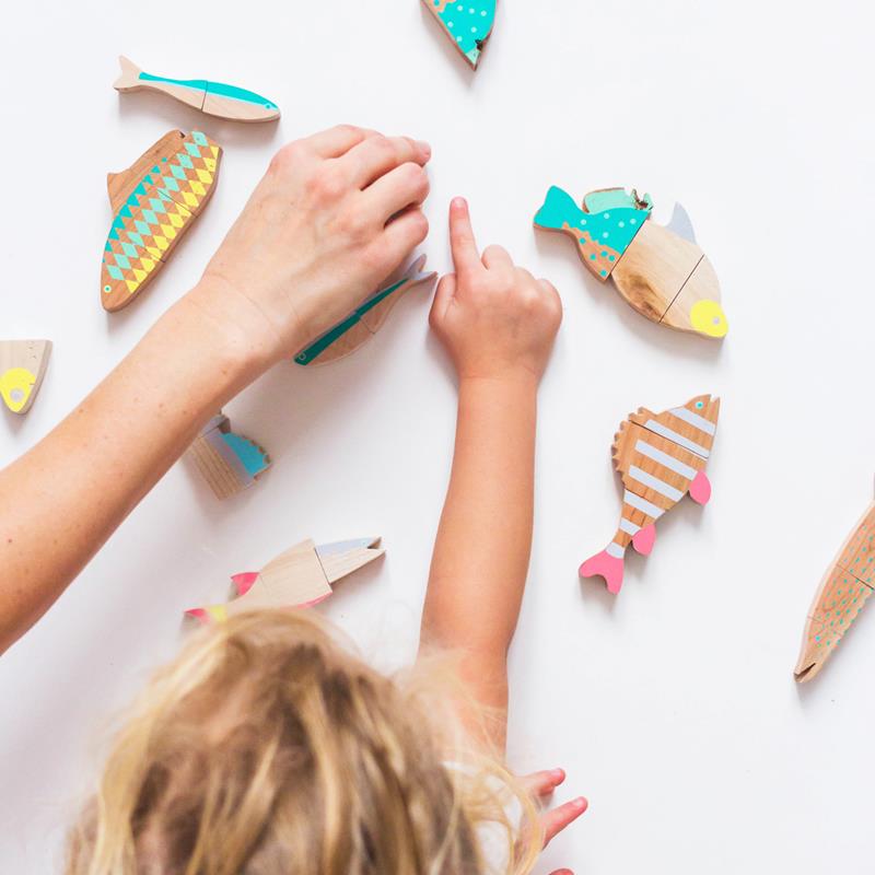 Este precioso set llamado Peces del Lago Balatón es un puzzle magnético fabricado a mano y al mismo tiempo un juego imaginativo. Cada uno de los 9 peces incluidos puede ser separado y combinado a través de los imanes. Tus peques podrán crear combinaciones y con ellas, los peces de sus sueños, mientras aprenden sobre las leyes de atracción de los imanes. Lostipos de peces están basados en las especies autóctonas que habitan las aguas del Lago Balatón en Hungría (pai´s del que proceden ests juguetes). Un lago precioso rodeado de montañas y de aguas muy frías, d modo que también podrás conversar sobre la diversidad de nuestro entorno natural. Este set contiene 9 piezas de aprox. 8 cm de longitud y fabricadas artesanalmente con madera de los bosques del Pilis Park Forestry Company (bosque sostenible). Recomendado para niñ@s a partir de los 3 años.