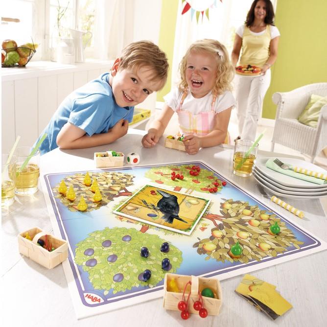 Los árboles del Frutal están cargados de frutas y el pícaro cuervo quiere hacerse con todas. Los jugadores intentan cosechar la fruta antes que el cuervo. En función del dado, los jugadores podrán recolectar una o dos frutas de un árbol e introducirlas en la cesta o colocar una pieza de puzzle en el centro del tablero. Si consiguen recolectar toda la fruta antes de que el puzzle del cuervo esté terminado, los jugadores ganarán la partida.