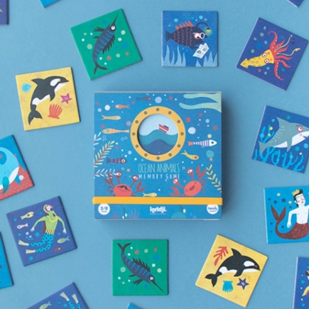 Ballenas, delfines, tiburones, peces abisales, sirenas y tritones y así ¡hasta completar 16 parejas!. Un juego de memoria con ilustraciones preciosas a cargo de Mariana Ruiz Johnson para pequeños, medianos y mayores, quien consiga formar más parejas haciendo buen uso de su memoria de pulpo, será el ganador