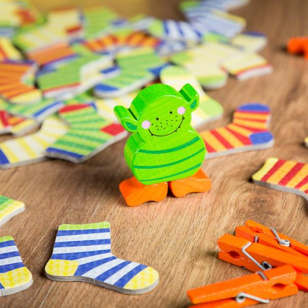 The sock monster has been in the cupboard! Who can find in this chaos the matching pairs of socks? Quickly and simultaneously the children rummage through the heap of socks searching for matching pairs. Be careful they all look so much alike! A monstrously quick searching game for 2 6 players.