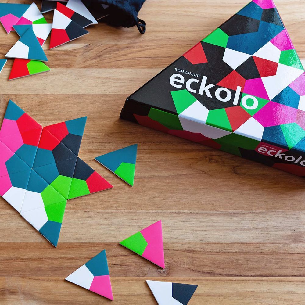 Eckolo de Remember es un juego de mesa familiar que puede recordarte a un dominó. Eso sí, jugamos con triángulos con colores, de forma que no será tan fácil como imaginas. El juego consiste en colocar nuestras piezas siguiendo un patrón cromático pues haremnos coincidir los colores de cada ficha por su diferentes lados. ¡Será como organizar un rompecabezas triangular! Las losetas de juego están fabricadas en un resistente de cartón con diferentes distribución de colores (en concreto, encontrarás 76 piezas-losetas en el juego). El resultado será un colorido mosaico completo para que coincidan entre sí con colores ¿Quién podrá poner más de sus piezas?. Aunque suene trivial, ¡el juego puede llevar horas! Es una gran idea para divertirse tanto en las largas tardes de invierno como en los días lluviosos de primavera o en las largas noches estivales. El juego desarrolla el pensamiento creativo y lógico, y además se es capaz de decorar cualquier interior. El juego diseñado por Remember ganó el premio RedDot Design Award por su espectacular propuesta y su fabricación de alta calidad. Apto para 2 a 8 jugadores a partir de 6 años.