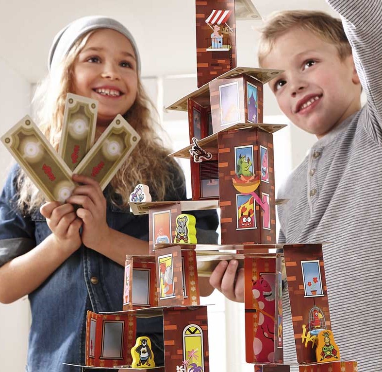 Rhino Hero y sus amigos superhéroes viven infinidad de aventuras en el rascacielos de cartas. Pero, cuidado, porque el rascacielos es cada vez más alto e inestable a medida que se le van añadiendo cartas. El que tire el dado con habilidad, mueve a sus superhéroes hacia arriba y defiende su lugar en las batallas contra otros jugadores... si no fuese por los monos-araña, que hacen tambalear el rascacielos.