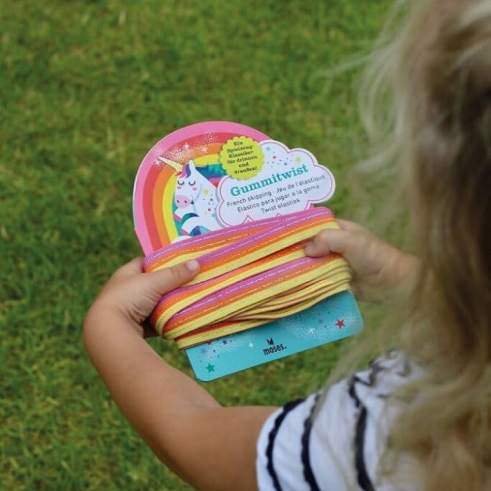 Este juego es un clásico ¿Cómo no ibas a encontrarlo en Kamchatka?. El twist de goma Rainbow de Moses es garantía de diversión para los niños y muy útil como juego de exterior ideal para cumpleaños infantiles o en el patio escolar durante el recreo. La cinta trenzada con hilo de purpurina brilla junto a los colores de un arcoíris ¡como si estuviera cubierta con polvo mágico de unicornio!
