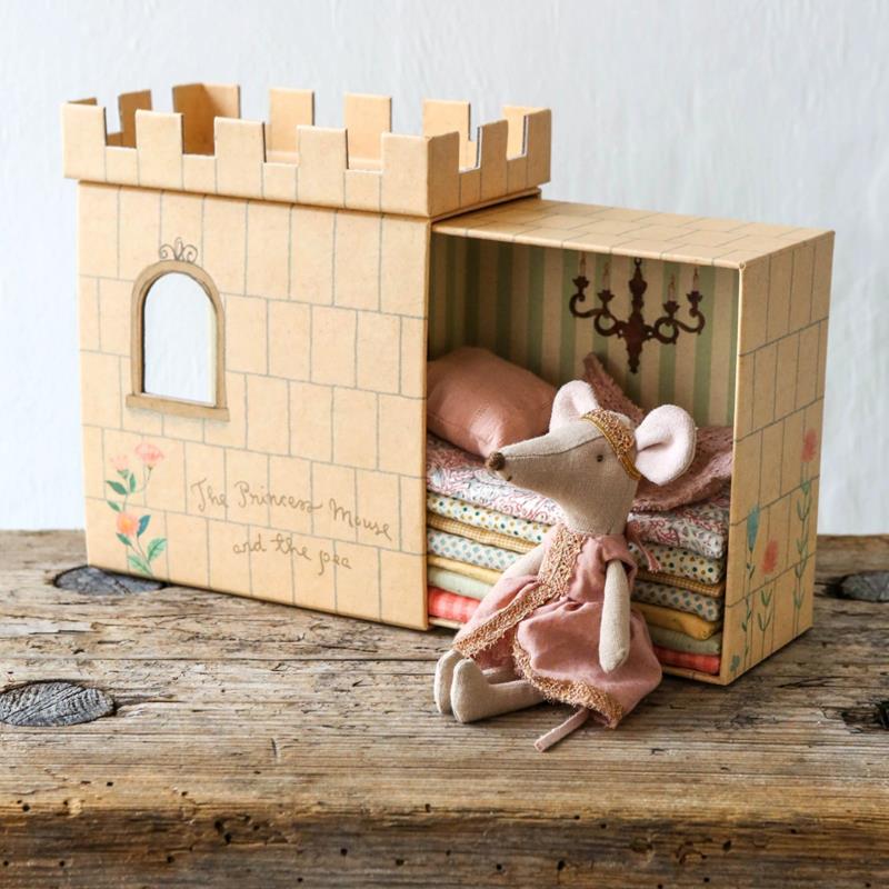 Una delicada ratona de algodón que duerme sobre edredones y colchones (y un guisante) ¿Puede haber una evocación más tierna del cuento de Andersen? Pues es difícil. Recupera la esencia del famoso cuento del escritor danés más importante de todos los tiempos. Andersen y La princesa y el guisante reinventados al más puro estilo Maileg, es decir, en su línea de ratoncitos llenos de detalles y ternura. Completamente hechos en algodón y con la delicadeza y los detalles que encantan a grandes y peques. El castillo de esta temporada A|W 2023 tiene un precioso color melocotón y los detalles del traje rosa con ribetes dorados hace a esta princesa muy especial. Calidad Maileg.
