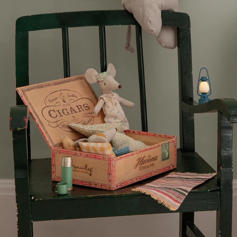 Una caja de habanos y dentro una pareja de ratoncitos que han hecho de esa caja su hogar. Mamá y papá ratones descansan con su pijama y antifaz en la suave camita con almohadas y manta, descubre el nuevo modelo que Maileg ha creado para esta colección de Primavera-verano 2022: ¡El Vichy vuelve a estar de moda!. Les gusta dormir y soñar con las aventuras que les espera al salir el sol. Un regalo precioso para expresar ternura y amor. Ratones de algodón que no pierden detalle y una camita confortable para dejarlos dormir y soñar. Apto a partir de 3 años. Calidad y diseño Maileg.