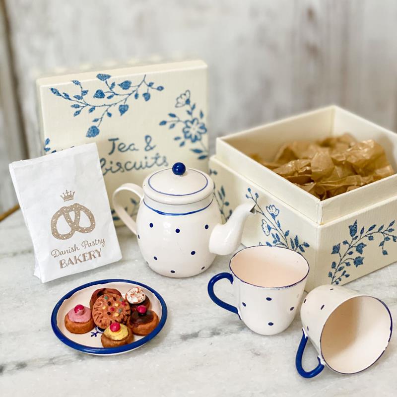 ¡La hora del té! ¿Quién puede resistirse a una buena taza de chapa y una tertulia amena en el jardín? Y es que tomar el té y charlar es lo que prefieren los conejos (tamaño My - T1 y T2) y los ratones de Maileg. Este simpático set consta de una bonita tetera con tapa, 2 tazas, un plato y una bolsa con 6 sabrosas galletas hechas a mano. Las galletas están hechas de resina sólida mientras que la tetera, las tazas y el plato están hechos de metal esmaltado. El conjunto está embalado en una bonita caja decorada. Un precioso accesorio para complementar tu casa o simplemente para jugar con tus conejitos y ratones de lino. Calidad y diseño Maileg. Apto a partir de 4 años.