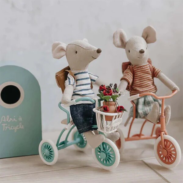 ¡Ring ring! va a sonar la campana del cole y hay que llegar a tiempo, pedaleando será más fácil llegar ¡y más divertido!. Los ratones hermano/a mayor encajan perfectamente en este triciclo de metal de precioso color azul petróleo. Nuestros nuevos ratoncitos escolares, llevan imanes en las manos así que sujetan fácilmente las asas. Este hermoso triciclo viene en una caja de garaje en robusto cartón y cierre magnético para expandir el juego. Se incluye el cesto metálico. Ratón NO incluido. Novedades Maileg en KamchatkaToys. Apto a partir de 3 años.