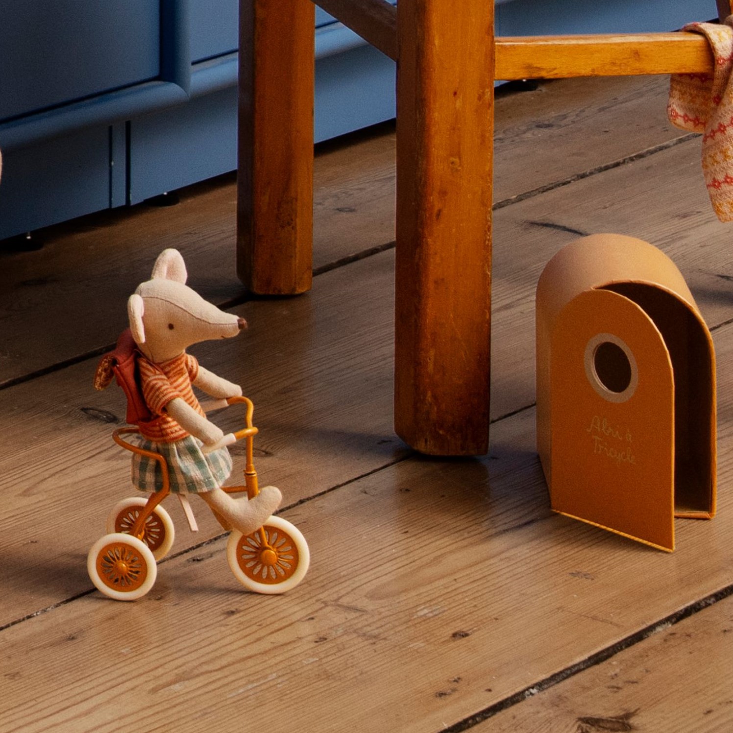"Riiiing" está a punto de sonar la campana que inicia el cole, y muy contenta y animosa va pedaleando de prisa la ratomcita hermana mayor, vestida con falda a cuadros y camisa listada para un día en la guardería o la escuela, lleva su mochila rosa a la espalda. Tiene imanes en sus manos para sostener las manijas del triciclo para un viaje rápido. Los triciclos pueden comprarse en nuestra web. Compatible con todos los accesorios de casas de muñeca Maileg