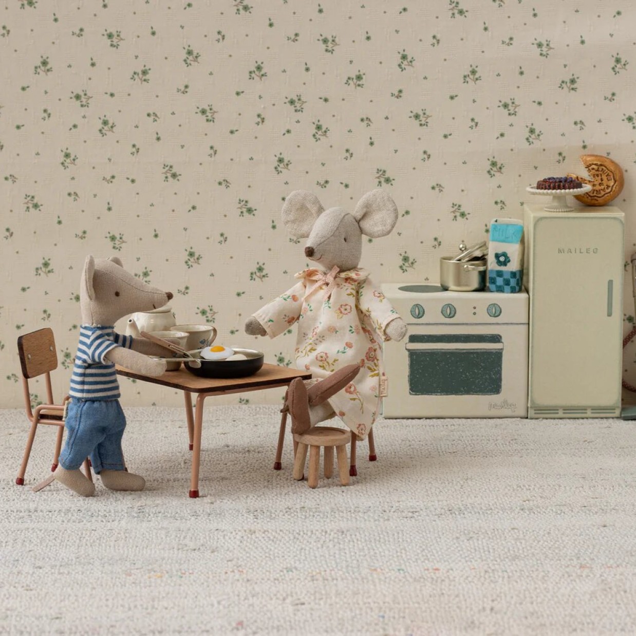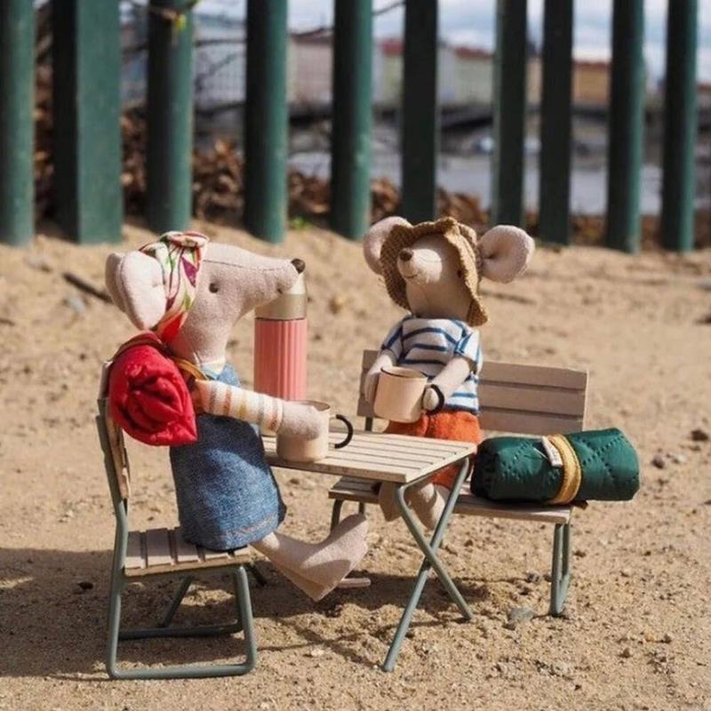 El conjunto de mesa y sillas Dark Powder de Maileg se compone de una mesa minimalista y dos sillas a juego. Los tableros y los asientos son de madera de alta calidad, mientras que las delicadas patas metálicas están pintadas en un rosa empolvado y rematadas con pequeños pies de color rosa oscuro.