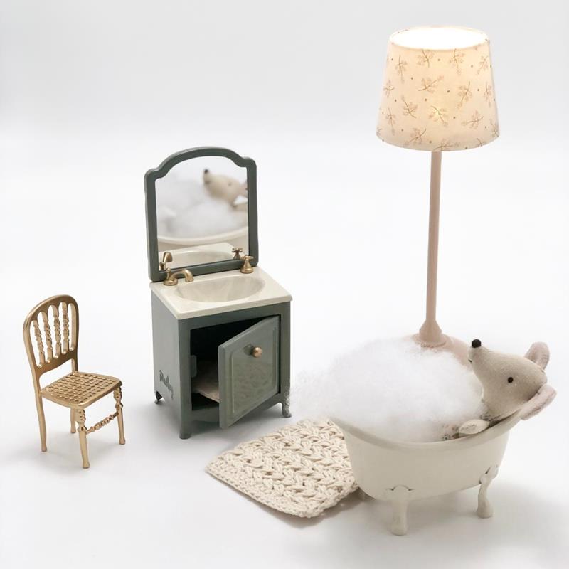 Pequeño mueble Maileg de metal pintado. Mueble con lavabo, grifería y espejo a juego. El pequeño mueble de baño es adecuado para los ratones Maileg. Apto a partir de 3 años.