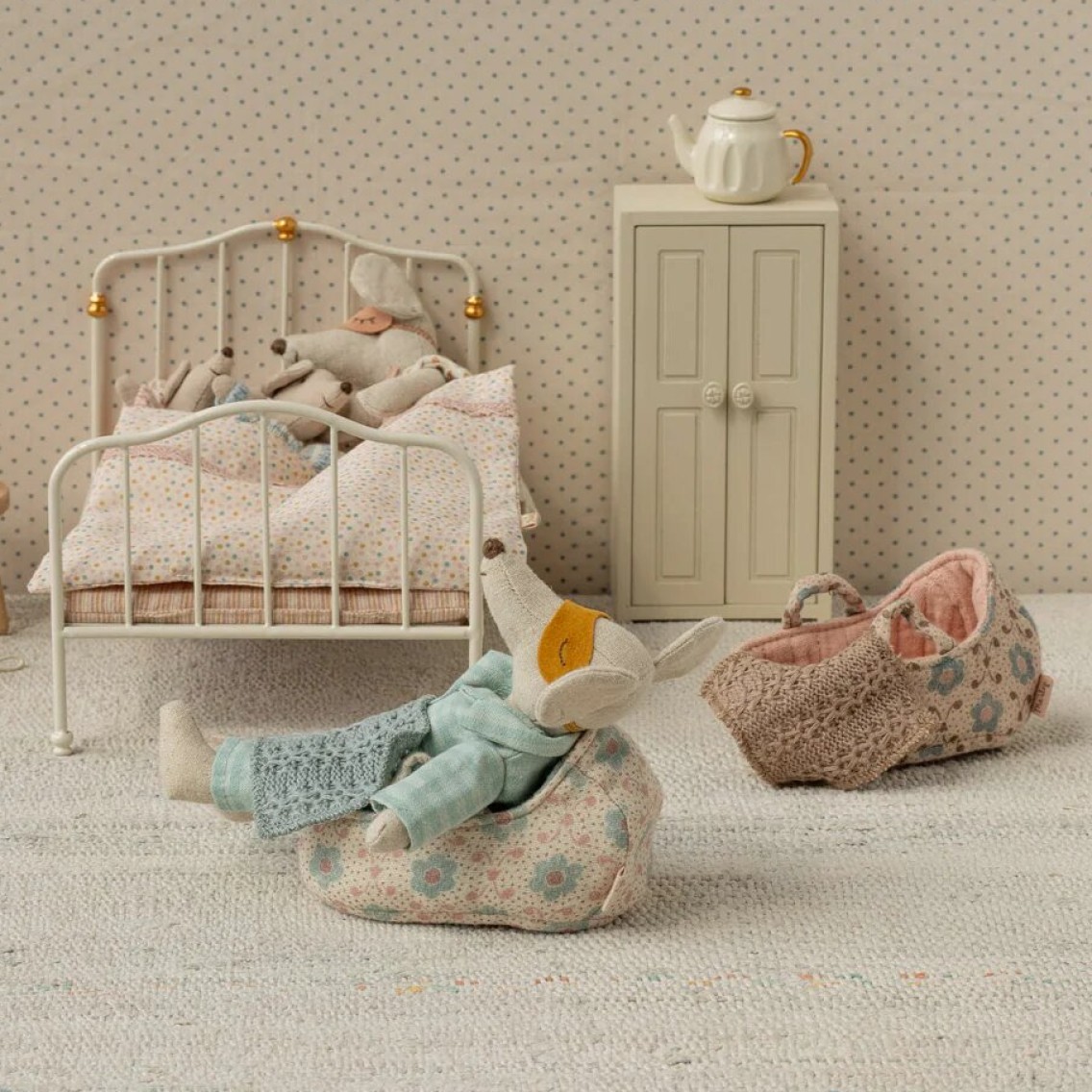 Accesorio de juego simbólico para el cuidado y el apego. El Carry Cot para Baby Mouse de Maileg es un delicado capazo de tela diseñado para acompañar el juego simbólico de cuidado. Pensado específicamente para los Baby Mouse, permite recrear situaciones cotidianas vinculadas al descanso, el traslado y la protección, favoreciendo la empatía y el vínculo afectivo.