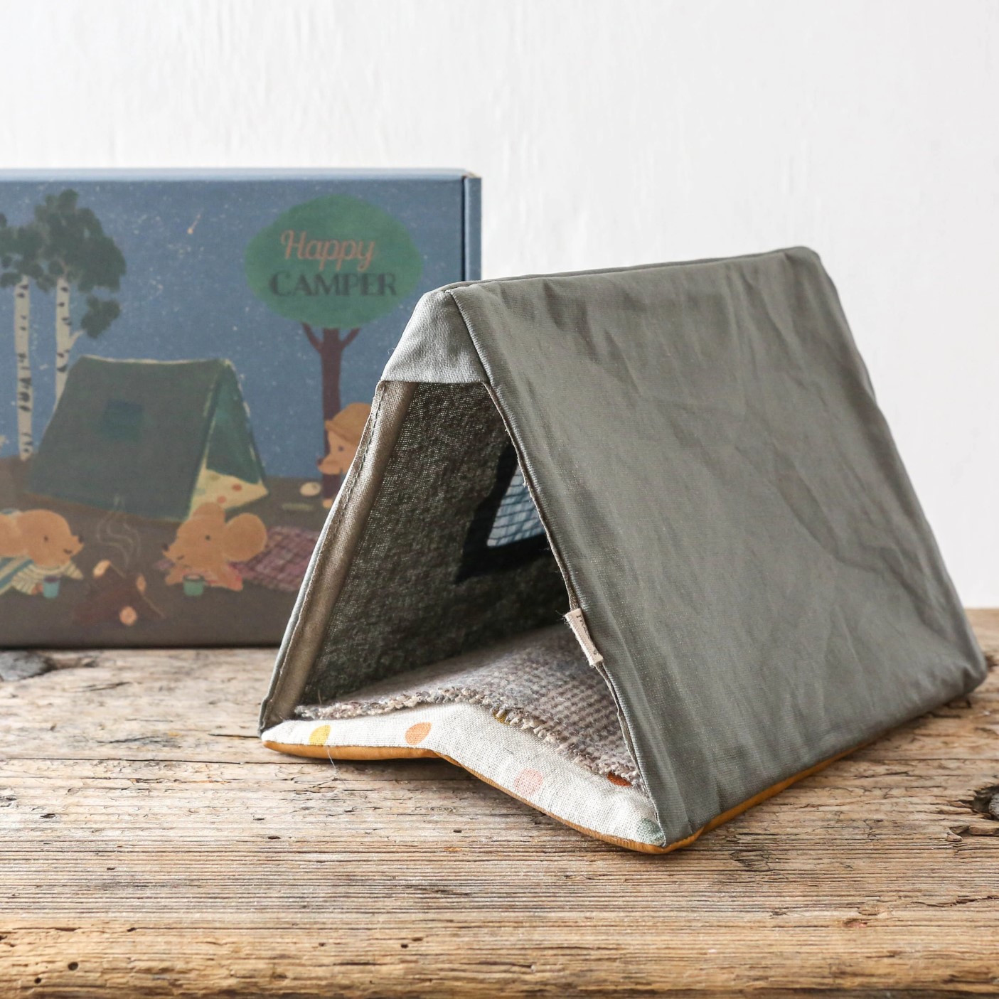 ¿Una noche al raso? ¡Pues claro! ¡A nuestros ratoncitos les encantan las aventuras! Lleva a tu ratón explorador a pasar la noche bajo las estrellas con la tienda plegable individual. La manta le mantendrá abrigadito durante la noche. El tejido exterior tiene una superficie recubierta para una apariencia más auténtica como las enceradas de verdad. Son perfectos para regalar junto a nuestra Ratoncita Exploradora o el Hiker Mouse ¡Ah! Y también para el Guía Explorador de Maileg.
