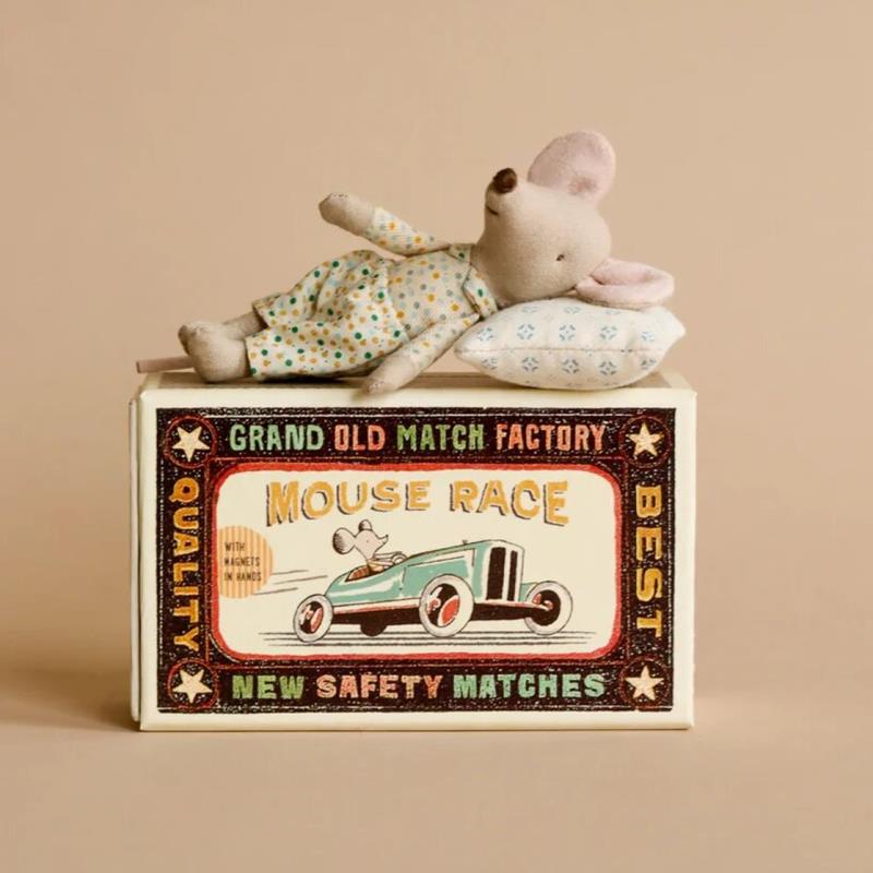 Un delicado ratoncito de algodón que duerme en una caja de cerillas ¿Puede haber algo más tierno? Pues es difícil. Recupera la esencia de los cuentos al más puro estilo Andersen con esta colección entrañable de ratoncitos. Completamente hechos en algodón y con la delicadeza y los detalles que encantan a grandes y peques. Este ratón Hermano Pequeño va ataviado con un pantaloncito de topos verde, ocre y celeste y camisa cosida a juego. Su colcha de punto en azul y los patrones varios de su almohadita y colchón serán el toque genial de su camita. Calidad Maileg. Fabricado en algodón y con detalles bordados. Apto a partir de 3 años.
