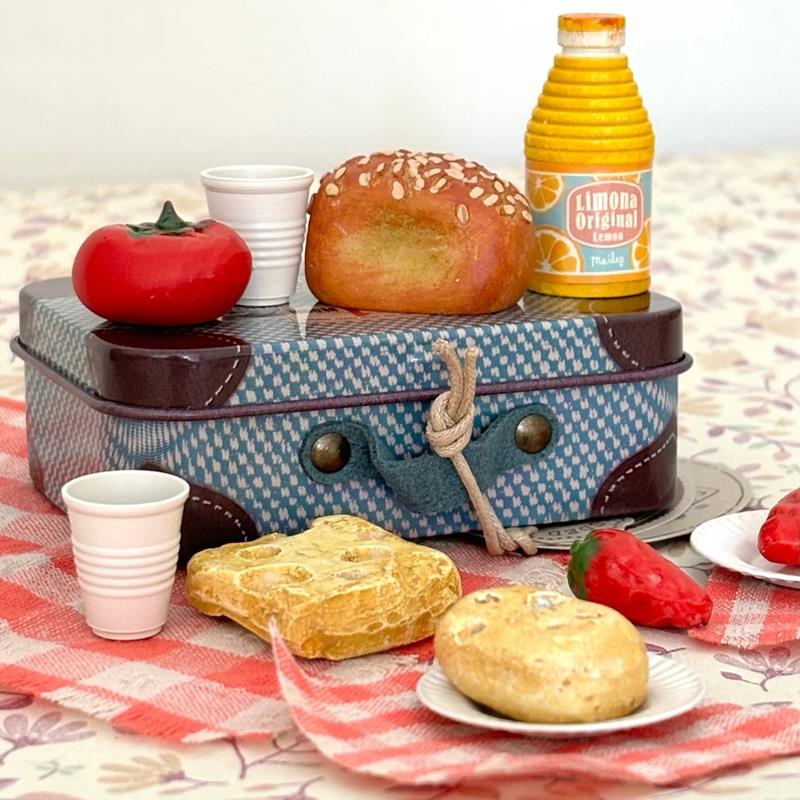 Un picnic con amigos, en el bosque, en el jardín o en una sala de juegos. En esta maleta de metal encontrarás la comida y los utensilios necesarios para un picnic perfecto para cualquier celebración ratona. La pintura puede tener ligeras variaciones porque cada pieza está fabricada y pintada a mano. Las piezas de alimentos son de resina y la vajilla de metal. Todo viene presentado en una maleta de metal decorada. Apto para los ratones de Maileg. A partir de 3 años.