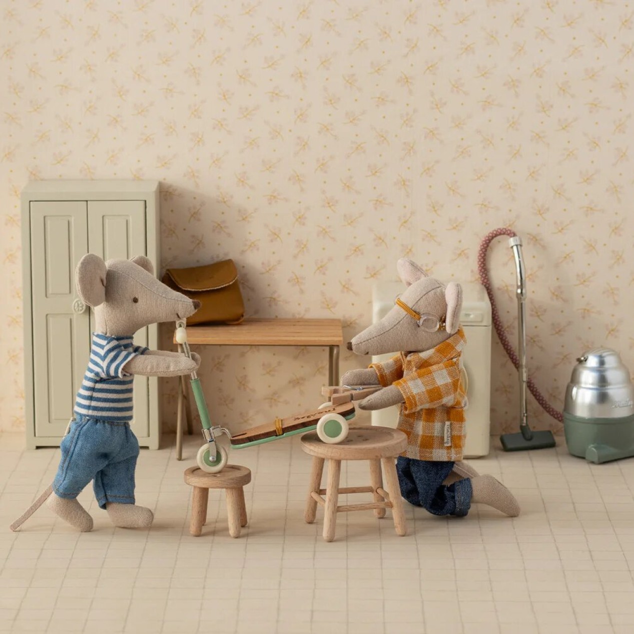 Este scooter para ratoncitos Maileg cuenta con un soporte para estacionarlo después de cada paseo, lo que lo convierte en un accesorio práctico y encantador. Con su diseño atemporal y colores suaves, es el complemento ideal para los escenarios de juego y casitas de muñecas.
