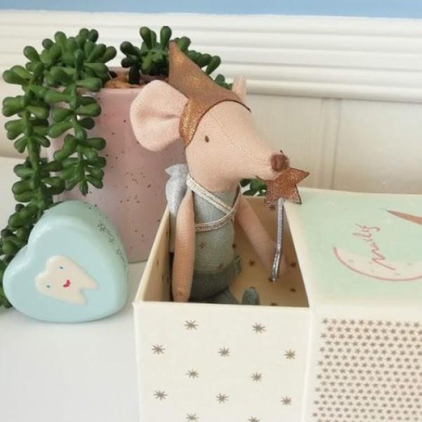 El hado de los dientes y los sueños de Maileg espolvoreará polvo de hadas sobre tus párpados con su varita mágica y te concederá dulces sueños. Además se llevará los dientes de leche que se han caído ylos hará brillar en el firmamento con las estrellas. Este hado de los dientes de Maileg e ve preciosa con su sombrero color bronce y su delicada varita mágica. Tiene en su tripera un pequeño bolsillo ideal para guardar el diente y las resplandecientes monedas! Una preciosa ratito que viene en una cajita de cerillas al estilo Maileg. El lindo ratón de hadas con dientes "hermano mayor" de Maileg viene con una pequeña caja de metal con forma de corazón para guardar tus dientes de leche.