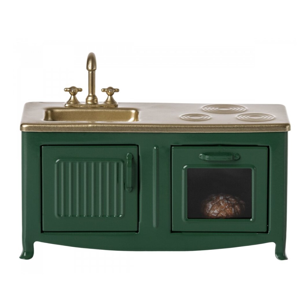 ¿Qué cenamos esta noche? Pues vamos a inspirarnos con la cocinita de Metal KITCHEN MOUSE de Maileg, fabricada sin escatimar detalles en metal. El corazón de todos los hogares es la cocina. Esta cocina de metal tiene un hermoso tono de color verde oscuro y muchos detalles divertidos así como la puerta del gabinete, el fregadero y un horno con pastel recién horneado. Perfecto para la familia de ratones. Apta para la casa de muñecas, el castillo o para jugar de sobremesa. Una cocinita delicada y con el diseño delicado y nórdico al que nos tiene acostumbrados Maileg. Contiene un pastel de resina. Apto a partir de 3 años. Dimensiones aproximadas 14 x 7.5cm