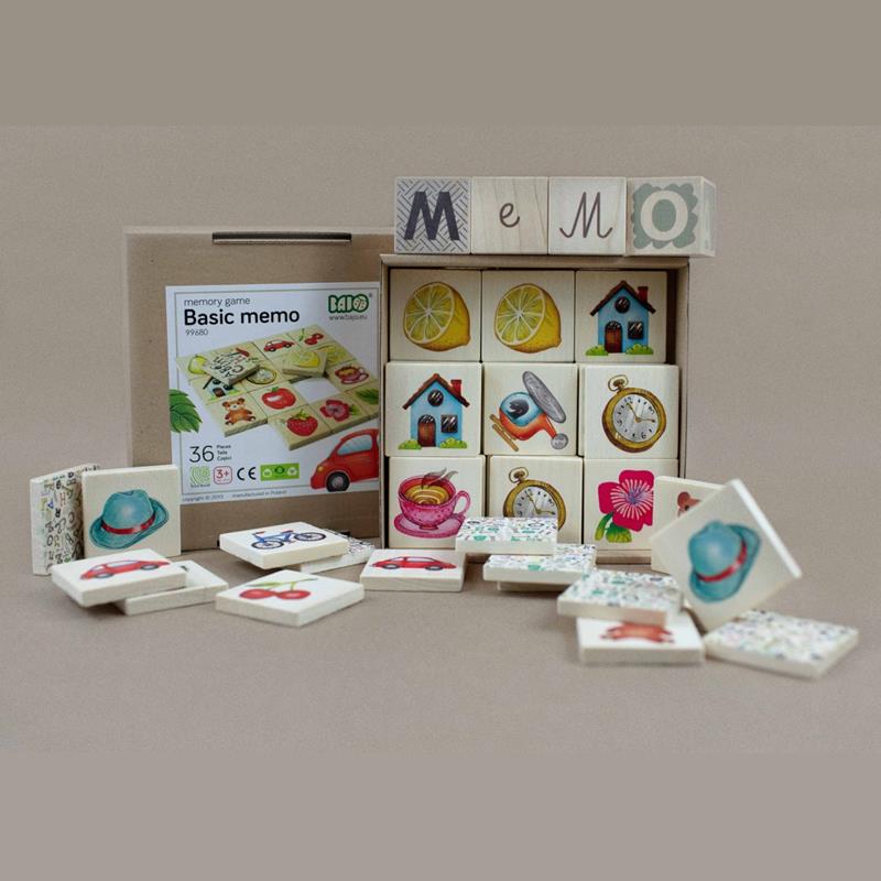 Este juego de memoria de Bajo representa 18 pares de imágenes sencillas para niños y niñas a partir de 3 años. Como todos los juegos de pareja, la dinámica es la misma: colocaremos las fichas boca abajo al azar y sin verlas previamente e iremos levantado por turnos, dos fichas. Si al darles la vuelta son iguales, nos quedamos la pareja, si no, volvemos a colocarlas boca abajo en el mismo lugar. ¿Serás capaz de recordar dónde estaba el otro sombrero? ¿Y la pareja del coche? Un juego de concentración, agudeza visual, observación y memoria que acercará a lxs más pequeños de casa al juego reglado, mientras aprenden a reconocer elementos cotidianos y aumentan su vocabulario. Apto a partir de 3-4 años y para dos o más jugadores. Un precioso juego de Bajo con la calidad y sensibilidad a la que nos tienen acostumbrados. Fabricado en Polonia con maderas sostenibles y tintes atóxicos. Un juguete ecológico y de consumo responsable.