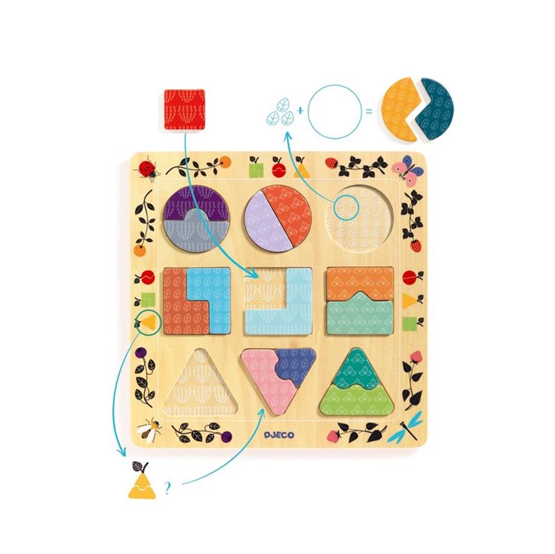 Combina las piezas para construir la forma geométrica adecuada siguiendo el patrón impreso en el fondo del tablero y la pieza. Un juego sencillo para favorecer la observación, la concentración y la asociación de conceptos. Jugando lxs peques podrán entender diferentes maneras de construir y combinar para crear la misma forma gométrica. Aprendizaje matemático de geometría a través de la manipulación. Desarrolla la coordinación ojo-mano y el razonamiento lógico. Juego afín a la pedagogía Montessori. Fabricante Djeco. Apto a partir de 3 años.