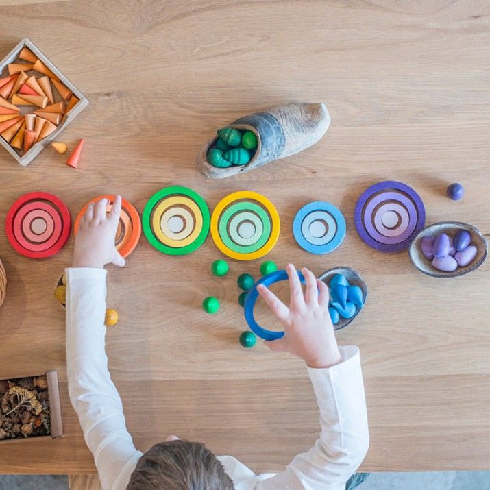 Seis juegos de cuatro anillos de madera en la paleta arcoíris de Grapat. Los anillos tipo nido (unos encajan dentro de otros) están en tonos graduados desde el más oscuro (anillo exterior) hasta el más claro (anillo interior). Un conjunto brillante y perfecto para combinar con el resto de los materiales de clasificación de Grapat y las piezas de mandala, así como los Nins o los Bowls Nido que encontrarás en nuestra web. Pero como siempre con el juego de piezas sueltas y material eurístico de Grapat ¡las posibilidades no se detienen allí! ¿Qué uso encontrarás tú para ellos?