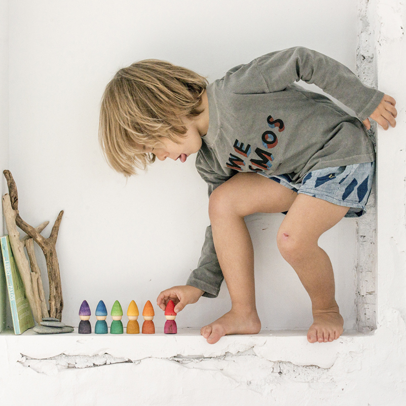 Una novedad preciosa de Grapat para añadir a los Mini Mundos, 6 Tomten Nin® en los colores del Arcoíris de 70 mm de altura. Los 6 Tomten permiten crear un juego inventado donde sus personajes pueden ser transformados según la imaginación de cada niño o niña soñando mundos imaginarios. Alimentar la imaginación de los peques y las peques es ofrecer materiales sencillos que abran posibilidades por lo poco estructurado de su contenido. Así los Tomten podrán ser duendes, niños, familias, maestros, bomberos o cuidadores de animales. Sin rostro para potenciar la capacidad productiva de los pequeños y el auto-reconocimiento de las emociones. Fabricados en madera maciza FSC, los Tomtens están teñidos con pinturas solubles al agua para garantizar la seguridad de tus peques y del planeta. Edad recomendada: +12 mesos