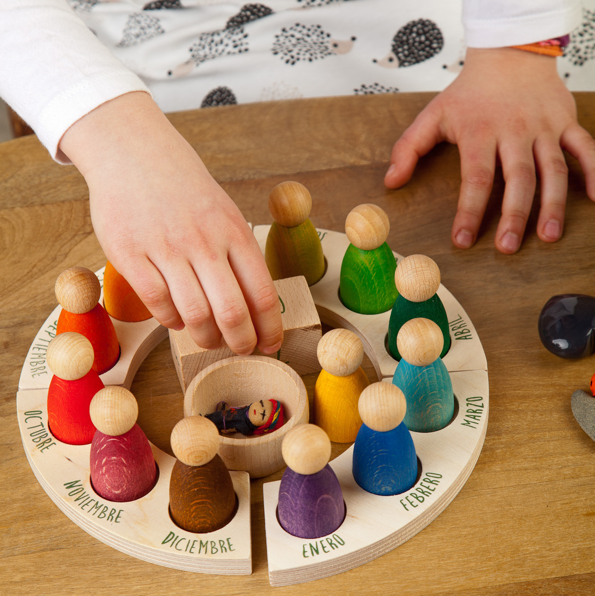 El Calendario Perpetuo Waldorf diseñado por Grapat Joguines es una herramienta manipulativa y activa que ayuda a los pequeños a comprender el paso del tiempo a través de la experiencia. Será mucho más sencillo y visual la división del año por estaciones y trimestres, mientras aprenden la secuencia mensual y los cambios que ocurren en las diferentes estaciones (invierno, proimavera, verano y otoño a través de los colores de la naturaleza a ellas asociadas. El gradiente de la escala cromática de Goethe está representado en cada uno de los 12 Nins incluidos y que se colocarán cada comienzo de mes. El conjunto incluye: